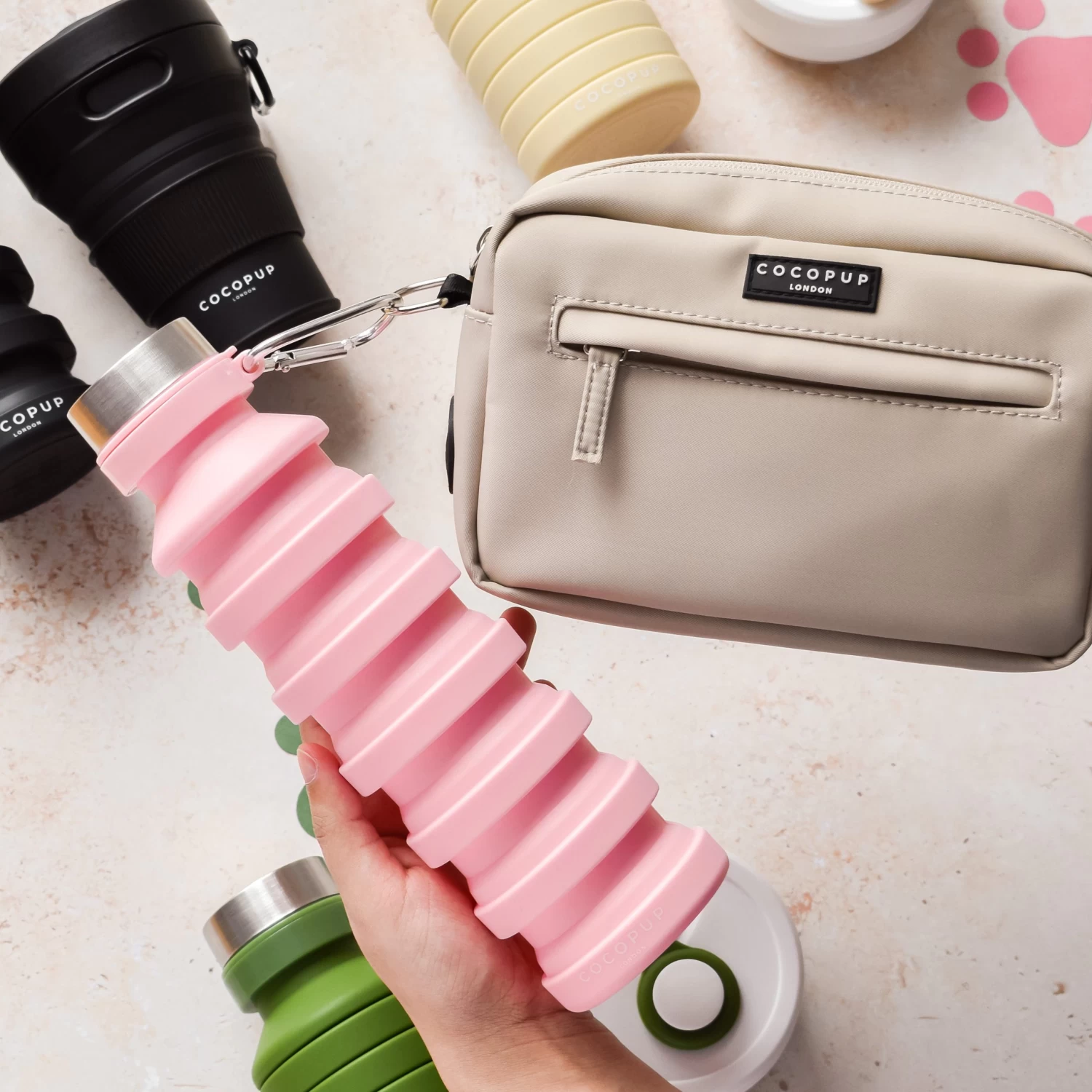 Say goodbye to the struggle of fitting your bottles in your bag, and hello to the Pink Collapsable Water Bottle. Our new bottle folds down to a compact size meaning you can fill up and rehydrate you and your pup no matter where your walkies takes you.