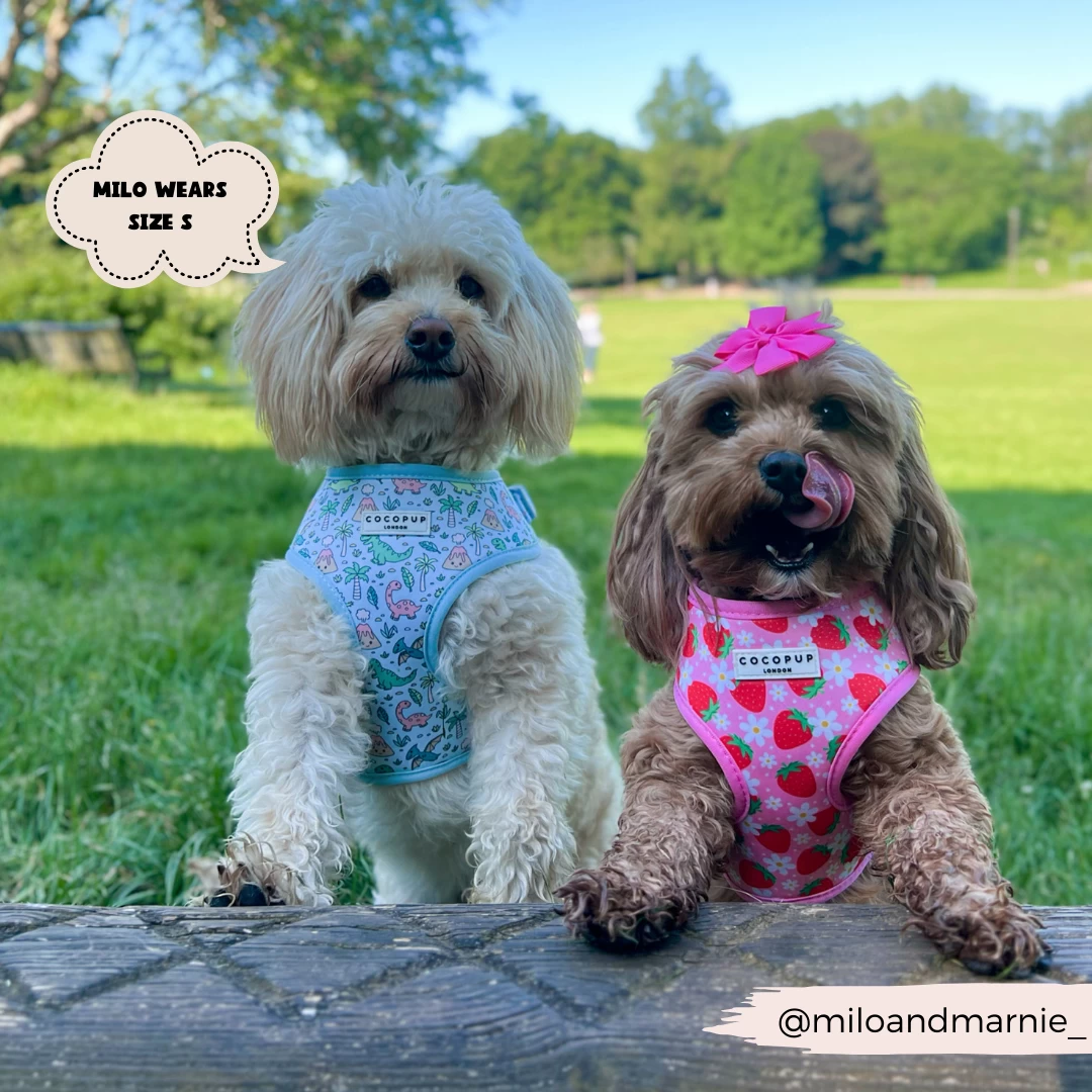 Our Adjustable Neck harnesses provide a comfy and stylish alternative to collars. Slide over your pup’s head, adjust at the neck and chest, fasten at the side and you’ll be “walkies” ready!