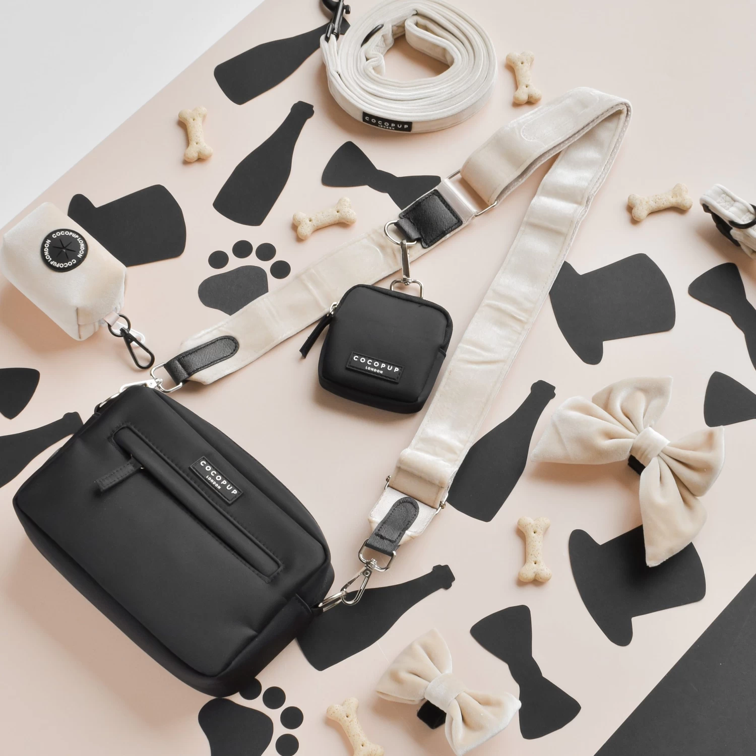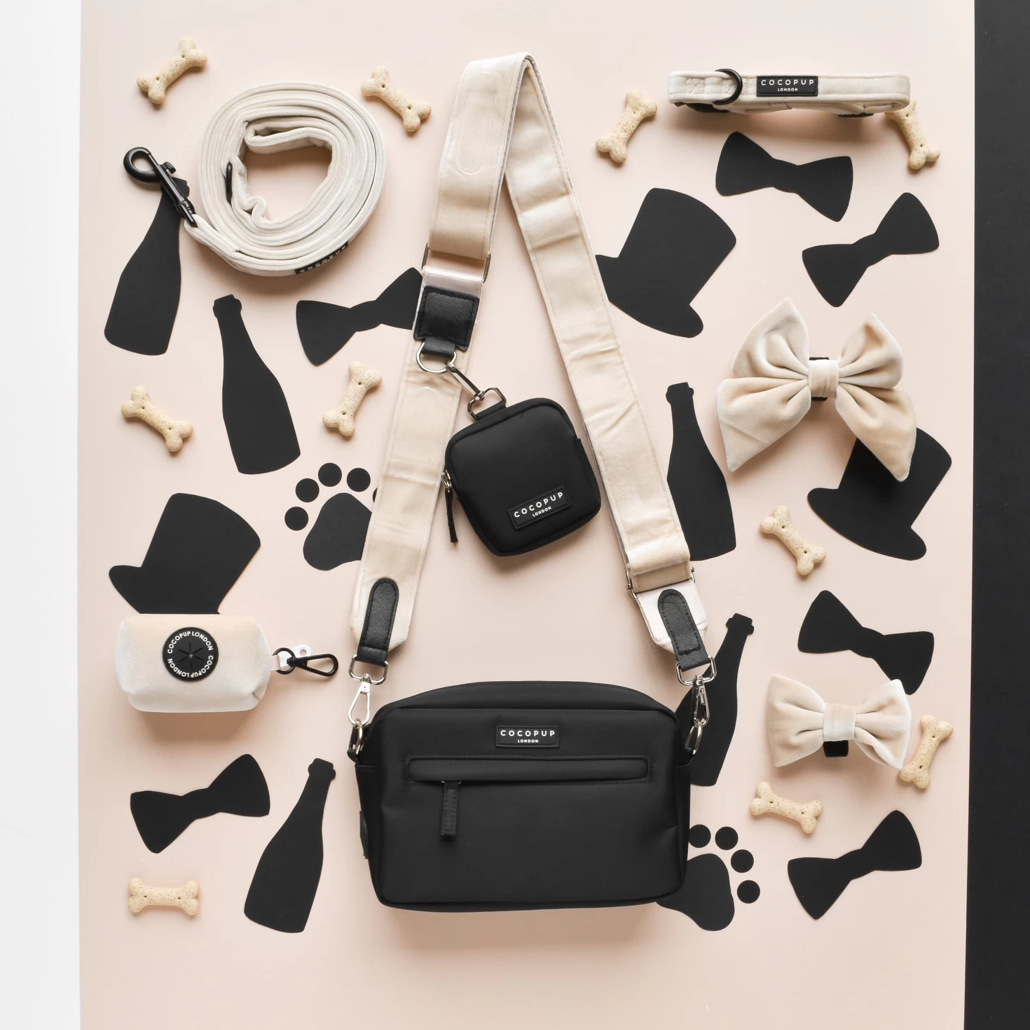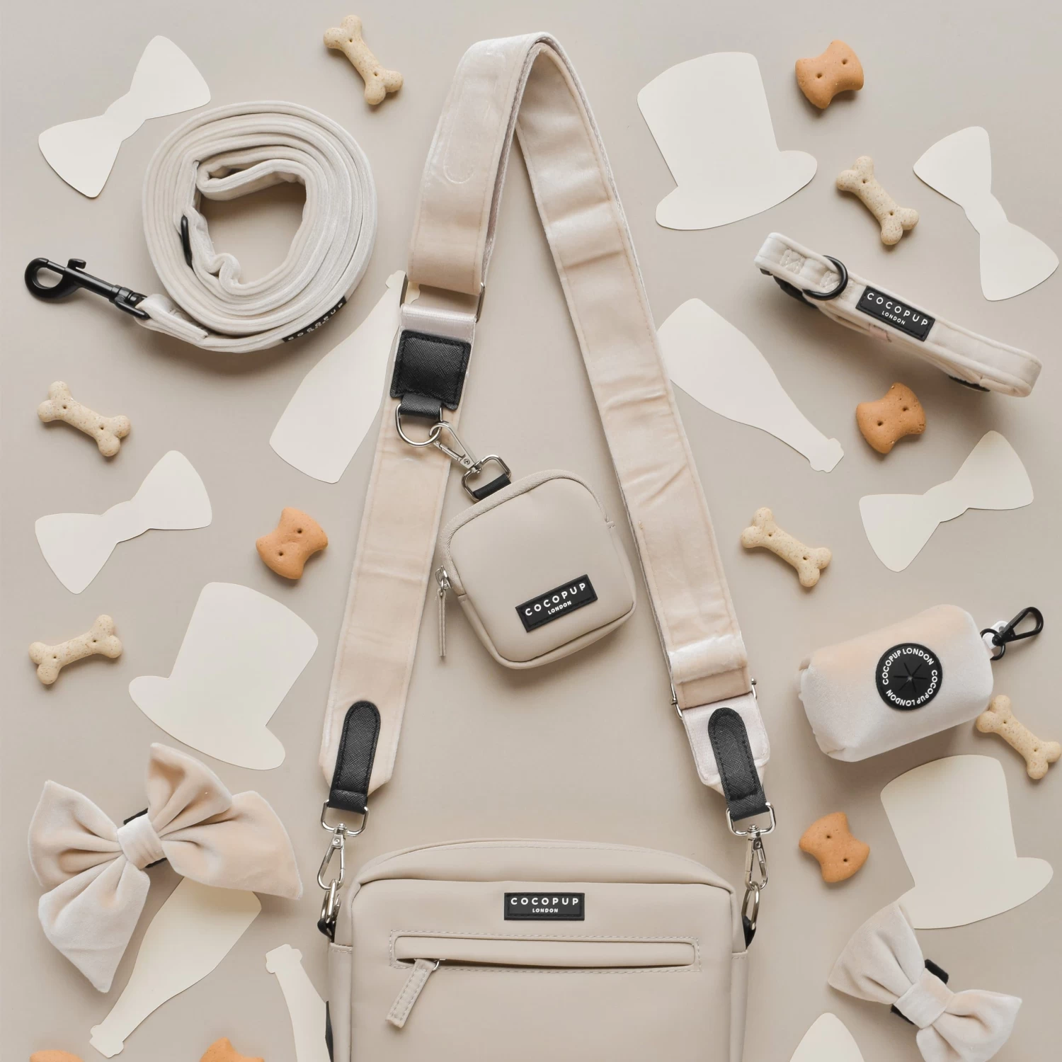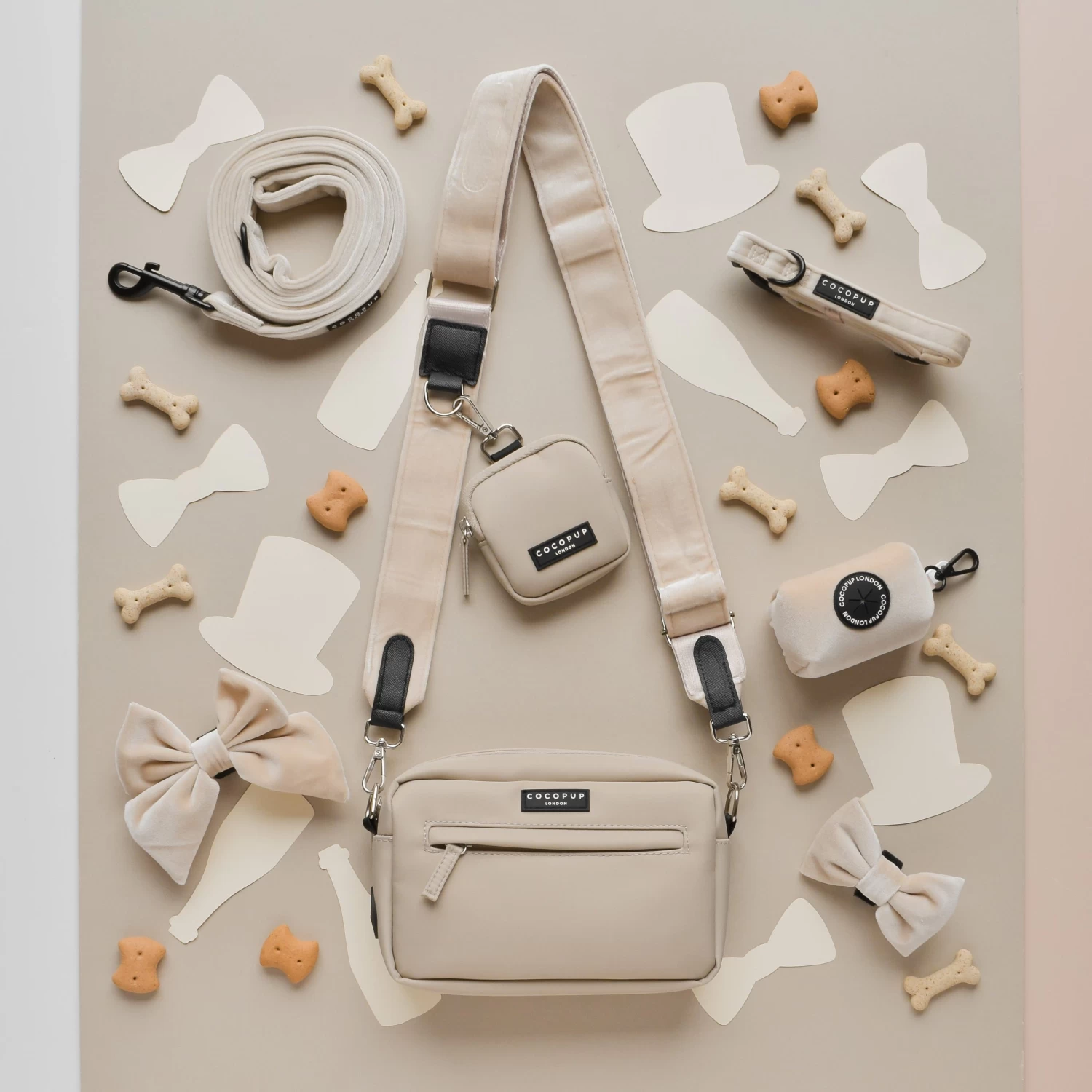 Our Bag Bundle includes: Bag, Treat Pouch & Champagne Velvet Strap (with inbuilt poop bag dispenser!)