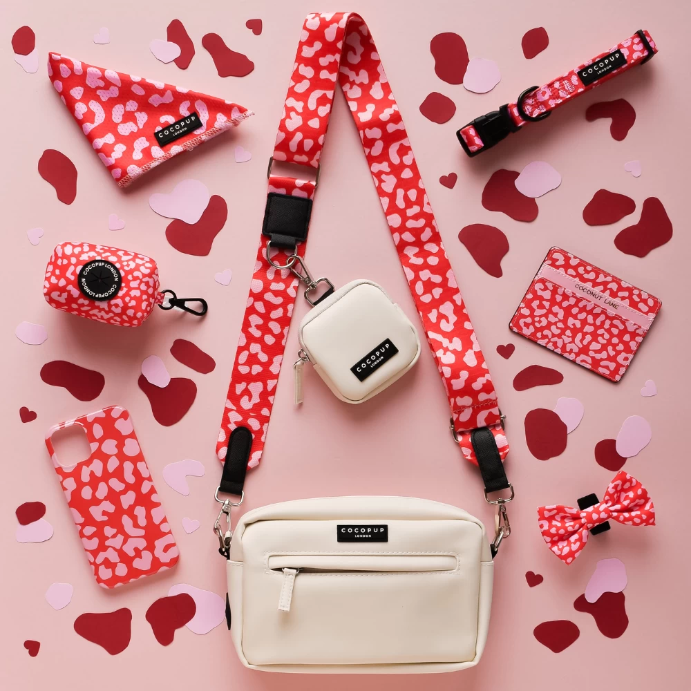 Our Bag Bundle includes: Oyster White Bag, Treat Pouch & Red & Pink Leopard Strap (with inbuilt poop bag dispenser!)