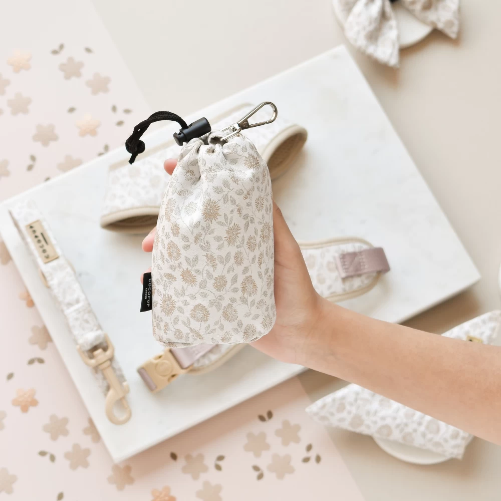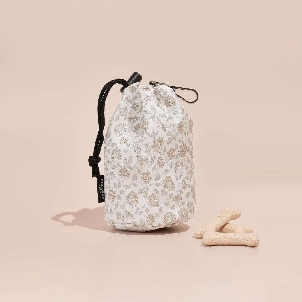 The perfect companion for dog walks, this Drawstring Treat Pouch features a stylish embroidered design inspired by a garden meadow. Stay chic while training your furry friend with this quirky and functional accessory.