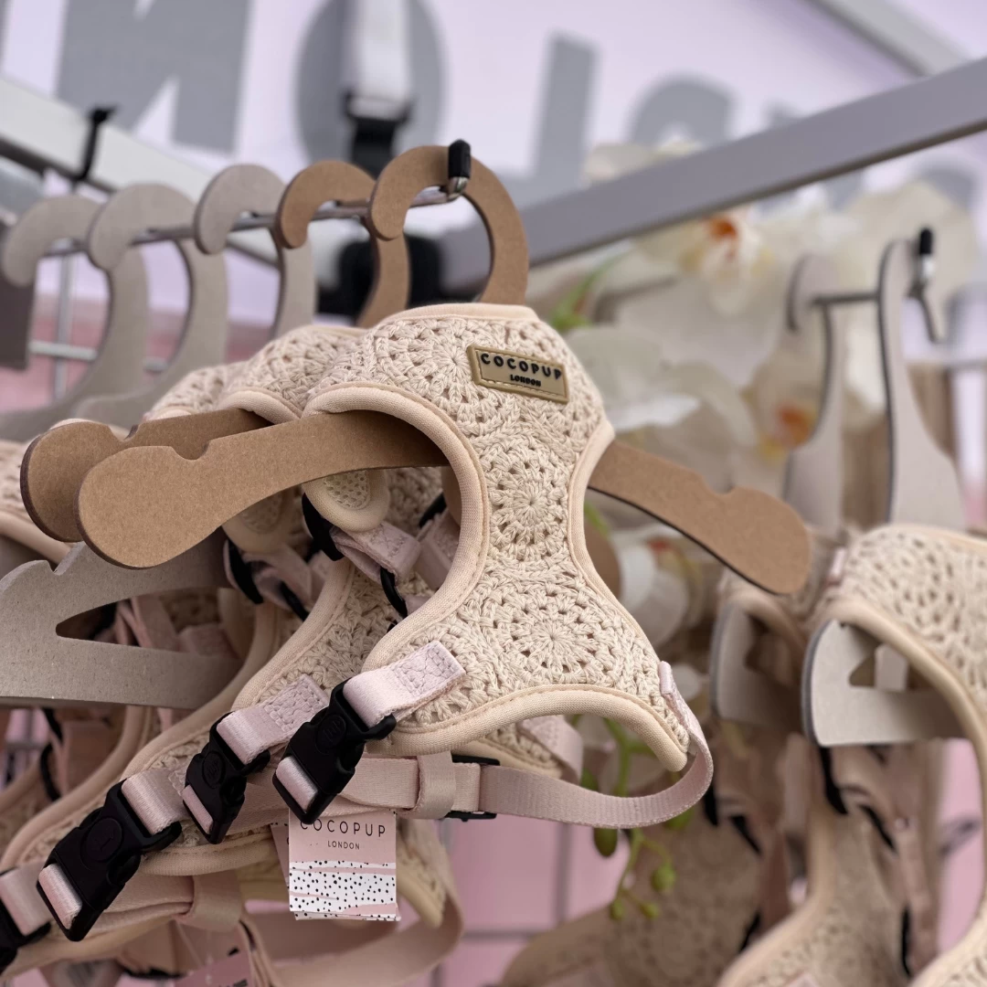 Our Adjustable Neck Harnesses provide a comfy and stylish alternative to collars. Slide over your pup’s head, adjust at the neck and chest, fasten at the side and you’ll be “walkies” ready!