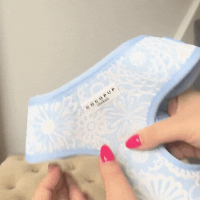 Introducing the Baby Blue Flower LUXE Adjustable Neck Harness. This stylish design will make heads turn with its gorgeous baby blue floral pattern. Buckle up and get your pup ready to bloom in style!