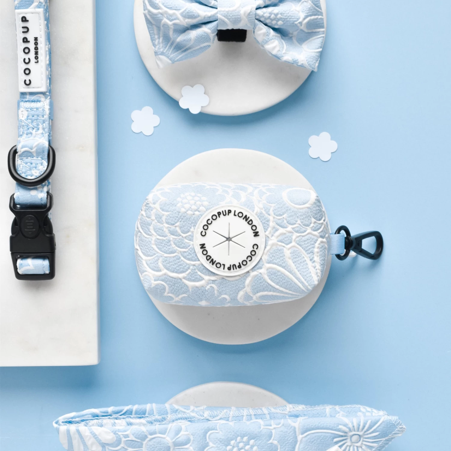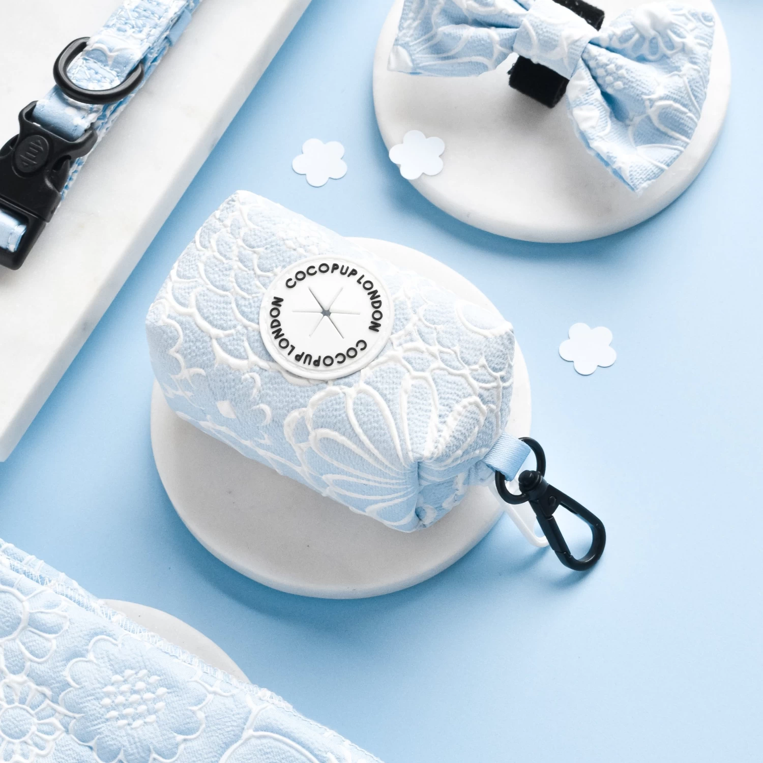 Show off your pup’s stylish side with the Baby Blue Flower Luxe Poop Bag Holder! This unique holder is perfect for carrying your poop bags, with a neutral floral pattern that’ll make walks even more fashionable! Can it get any cuter?!