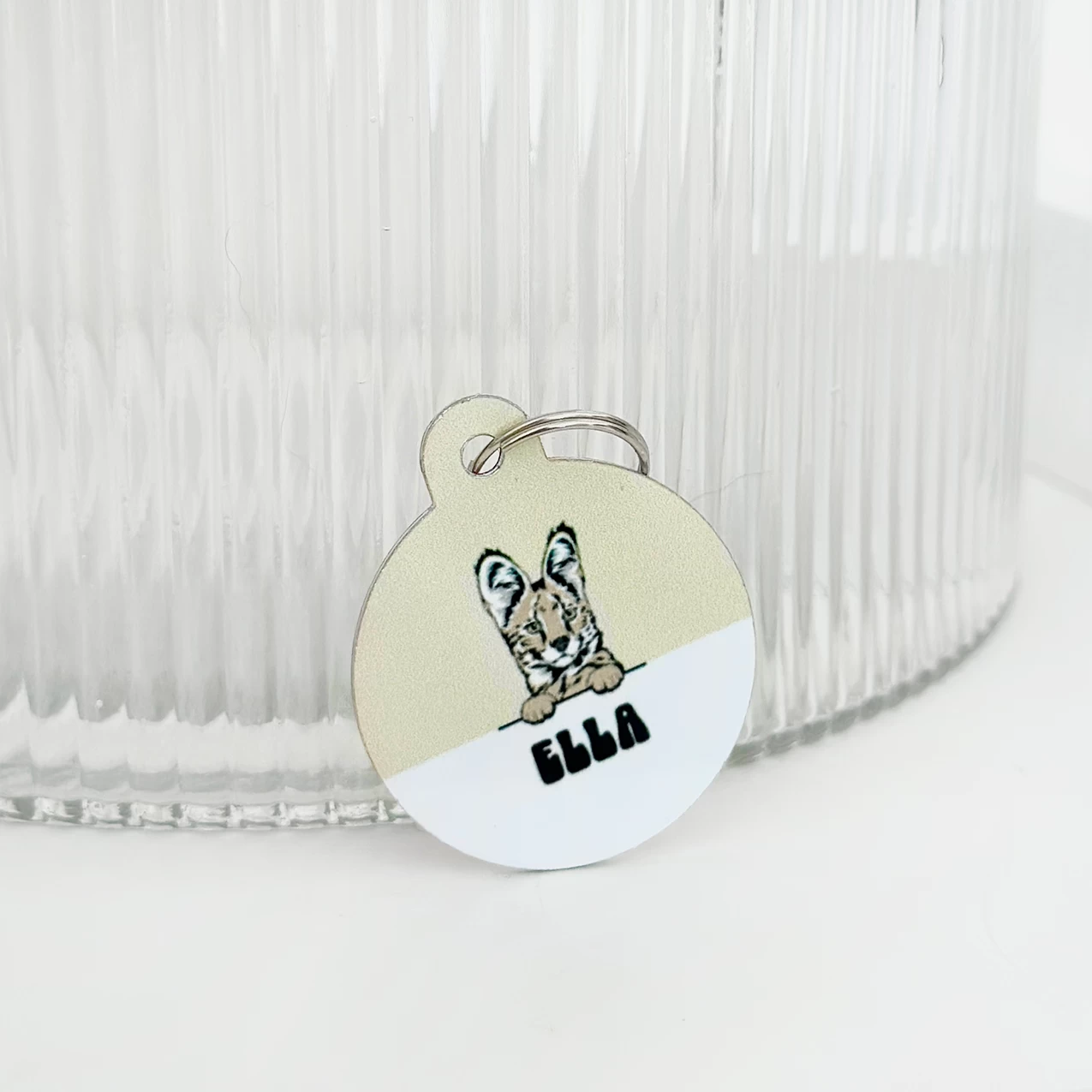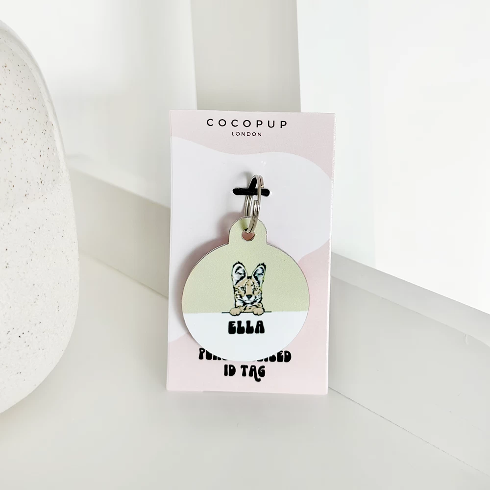 The tag is double sided, the front features a chic nude & white colour way with a super cute cartoon version of your cat along with their name. On the back we can print key important information such as your last name, address and phone number.Â