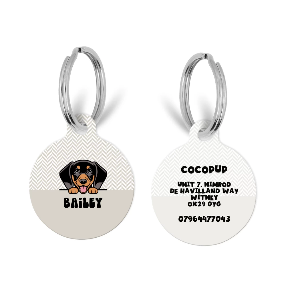 The tag is double sided, the front features your fave Cocopup Brown Tweed print with a super cute cartoon version of your doggo along with their name. On the back we can print key important information such as your last name, address and phone number. Our ID tags will ensure you pooch can strut its stuff in style.