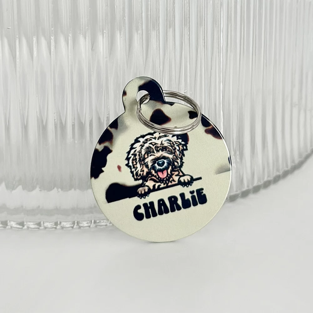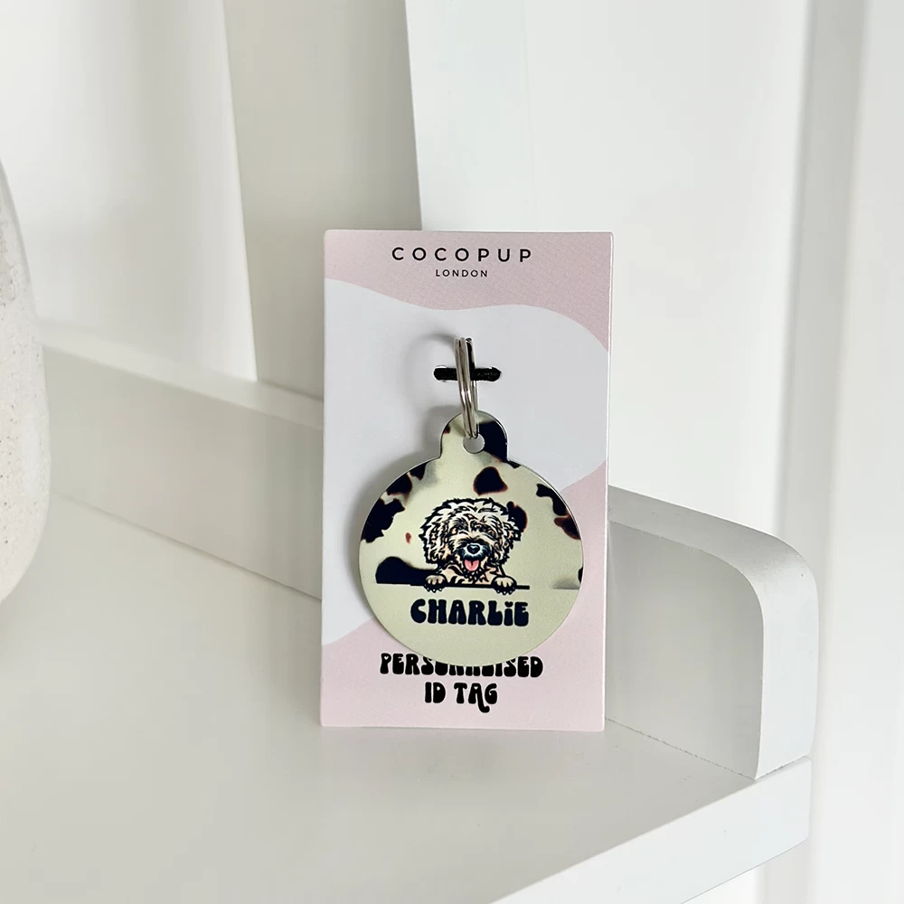 The tag is double sided, the front features your fave Cocopup Ivory Tort print with a super cute cartoon version of your doggo along with their name. On the back we can print key important information such as your last name, address and phone number. Our ID tags will ensure you pooch can strut its stuff in style.