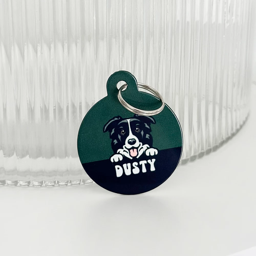 The tag is double sided, the front features a chic Khaki Shade with a super cute cartoon version of your doggo along with their name. On the back we can print key important information such as your last name, address and phone number. Our ID tags will ensure you pooch can strut its stuff in style.