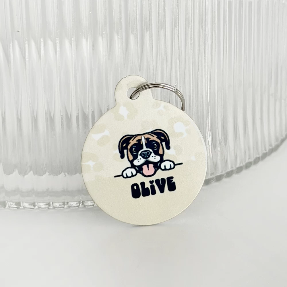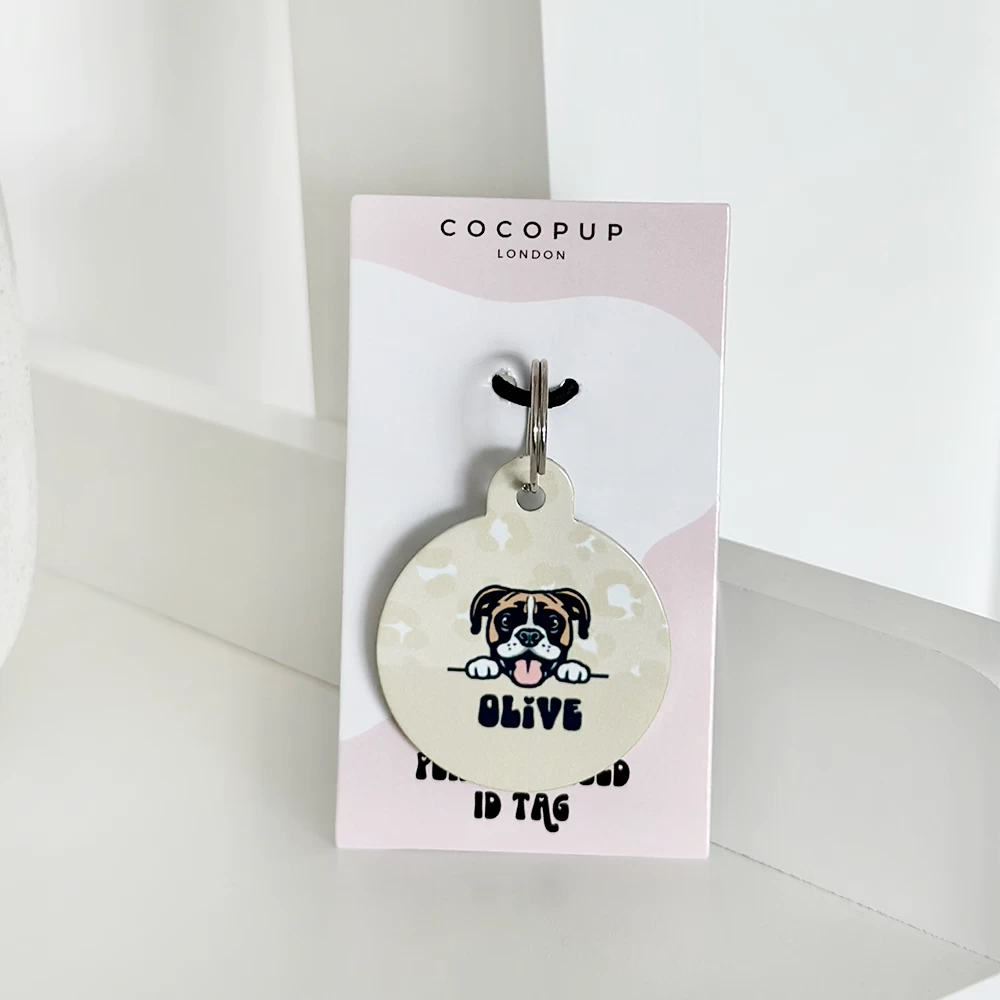 The tag is double sided, the front features a chic Nude Chic Leopard design with a super cute cartoon version of your doggo along with their name. On the back we can print key important information such as your last name, address and phone number. Our ID tags will ensure you pooch can strut its stuff in style.