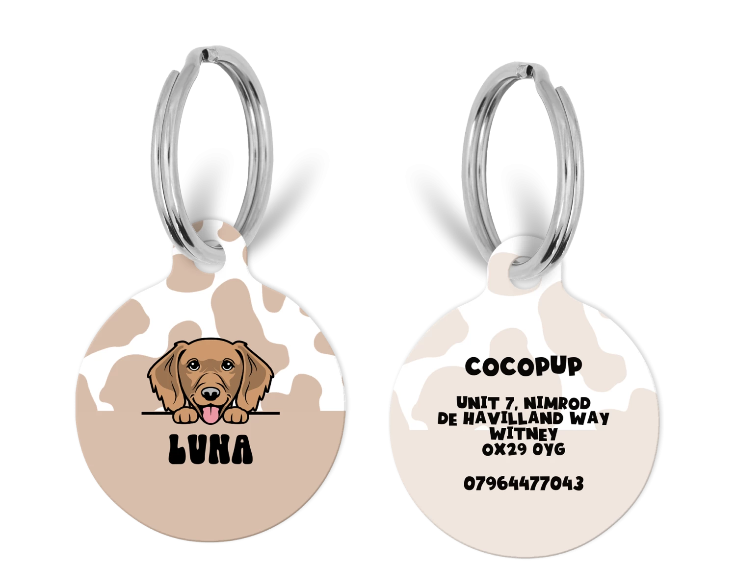 The tag is double sided, the front features your fave Cocopup Nude Cow print with a super cute cartoon version of your doggo along with their name. On the back we can print key important information such as your last name, address and phone number. Our ID tags will ensure you pooch can strut its stuff in style.