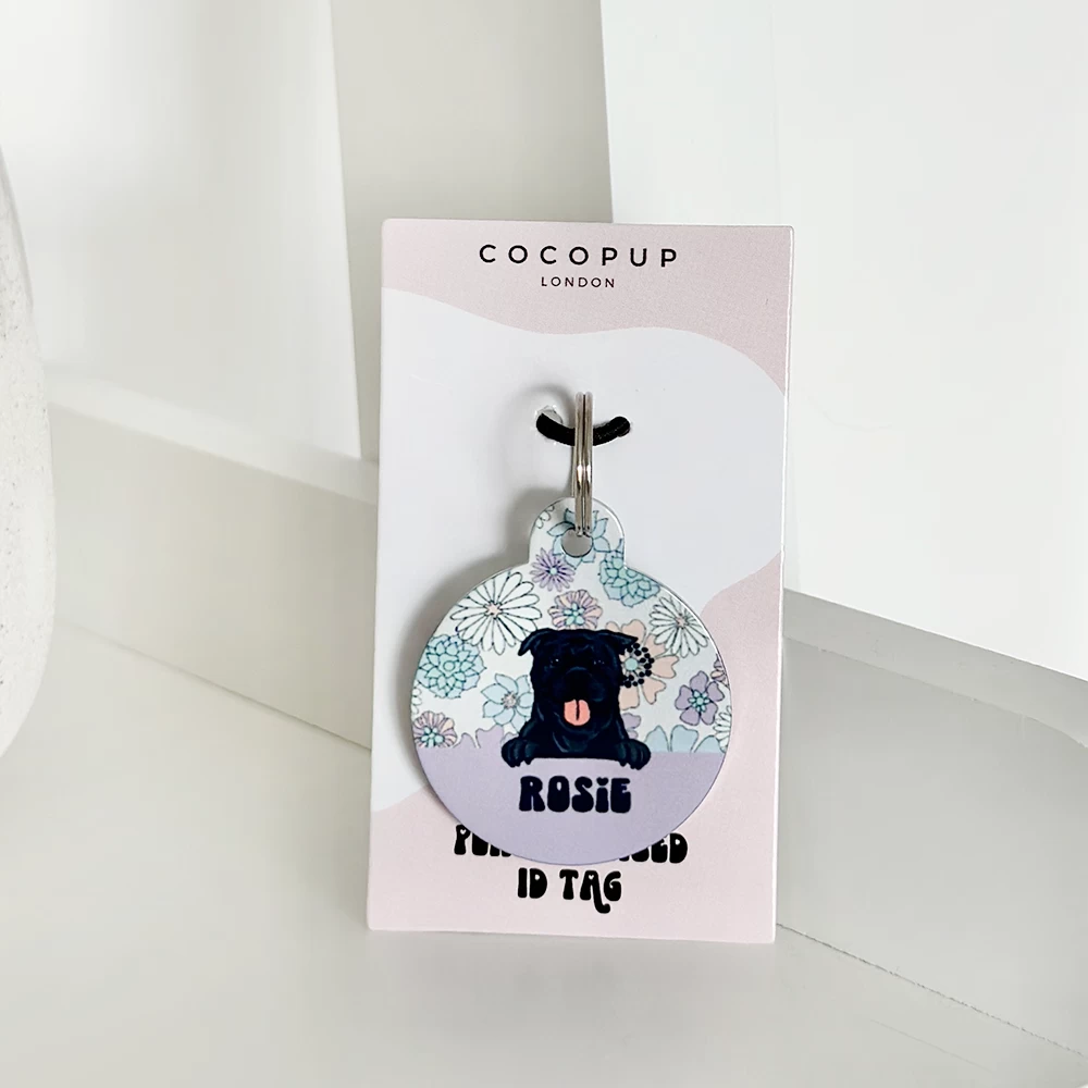 The tag is double sided, the front features your fave Cocopup Pastel Flowers print with a super cute cartoon version of your doggo along with their name. On the back we can print key important information such as your last name, address and phone number. Our ID tags will ensure you pooch can strut its stuff in style.