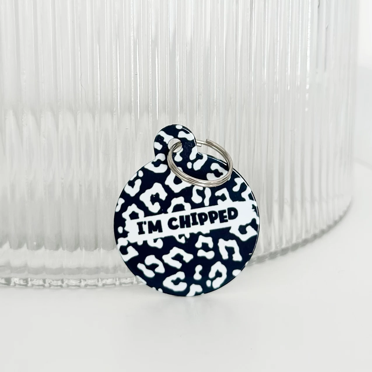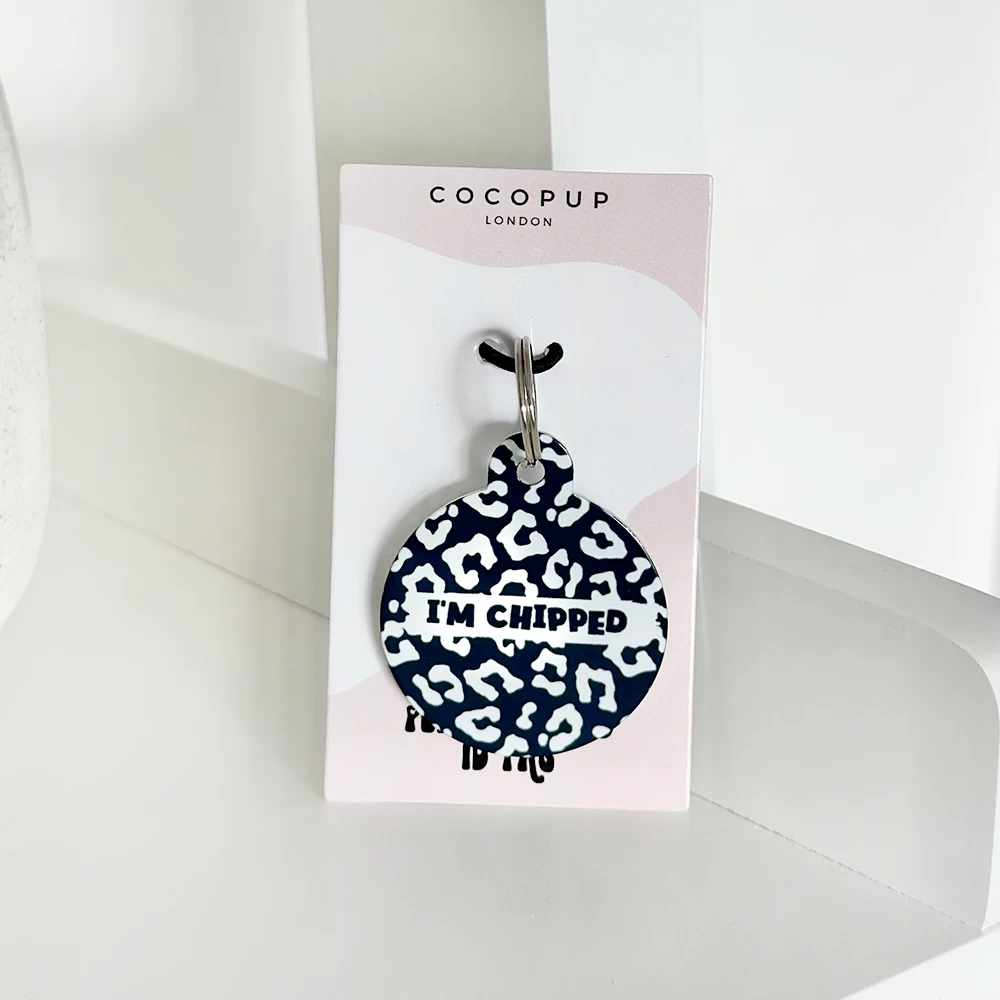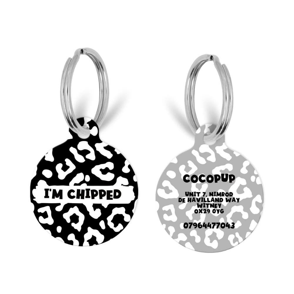 The tag is double sided, the front features your fave Cocopup Black Leopard print with the ‘I’m Chipped’ slogan so everyone knows! On the back we can print key important information such as your last name, address and phone number.
