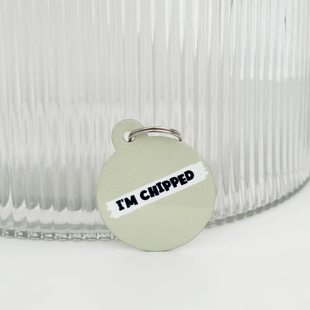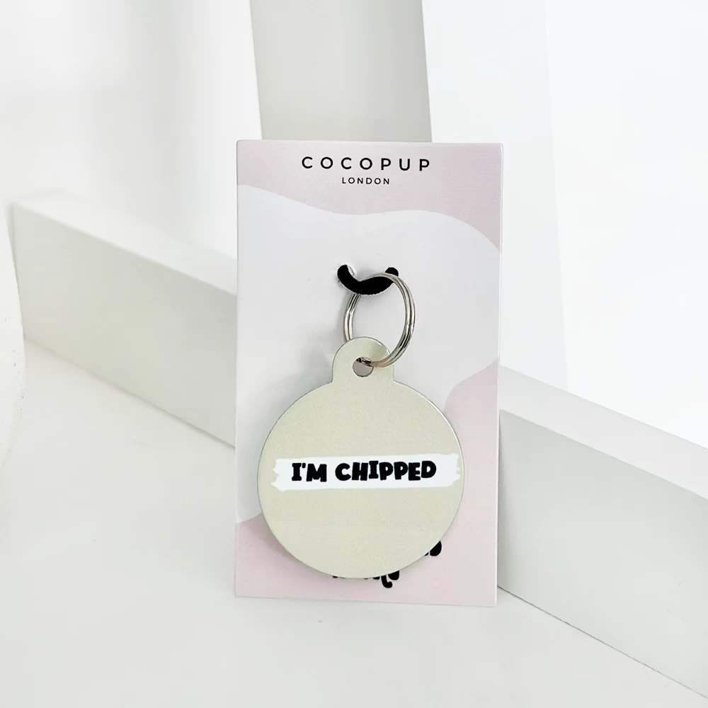 The tag is double sided, the front features your fave Nude print with the ‘I’m Chipped’ slogan so everyone knows! On the back we can print key important information such as your last name, address and phone number.