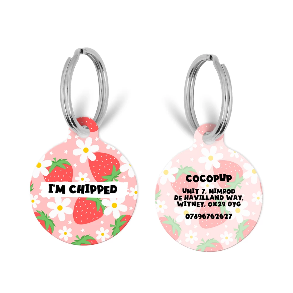 The tag is double sided, the front features your fave Cocopup Pupberry Fields print with the ‘I’m Chipped’ slogan so everyone knows! On the back we can print key important information such as your last name, address and phone number.Â