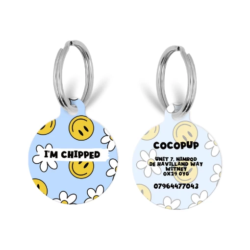 The tag is double sided, the front features a cute butterfly print with the ‘I’m Chipped’ slogan so everyone knows! On the back we can print key important information such as your last name, address and phone number.Â