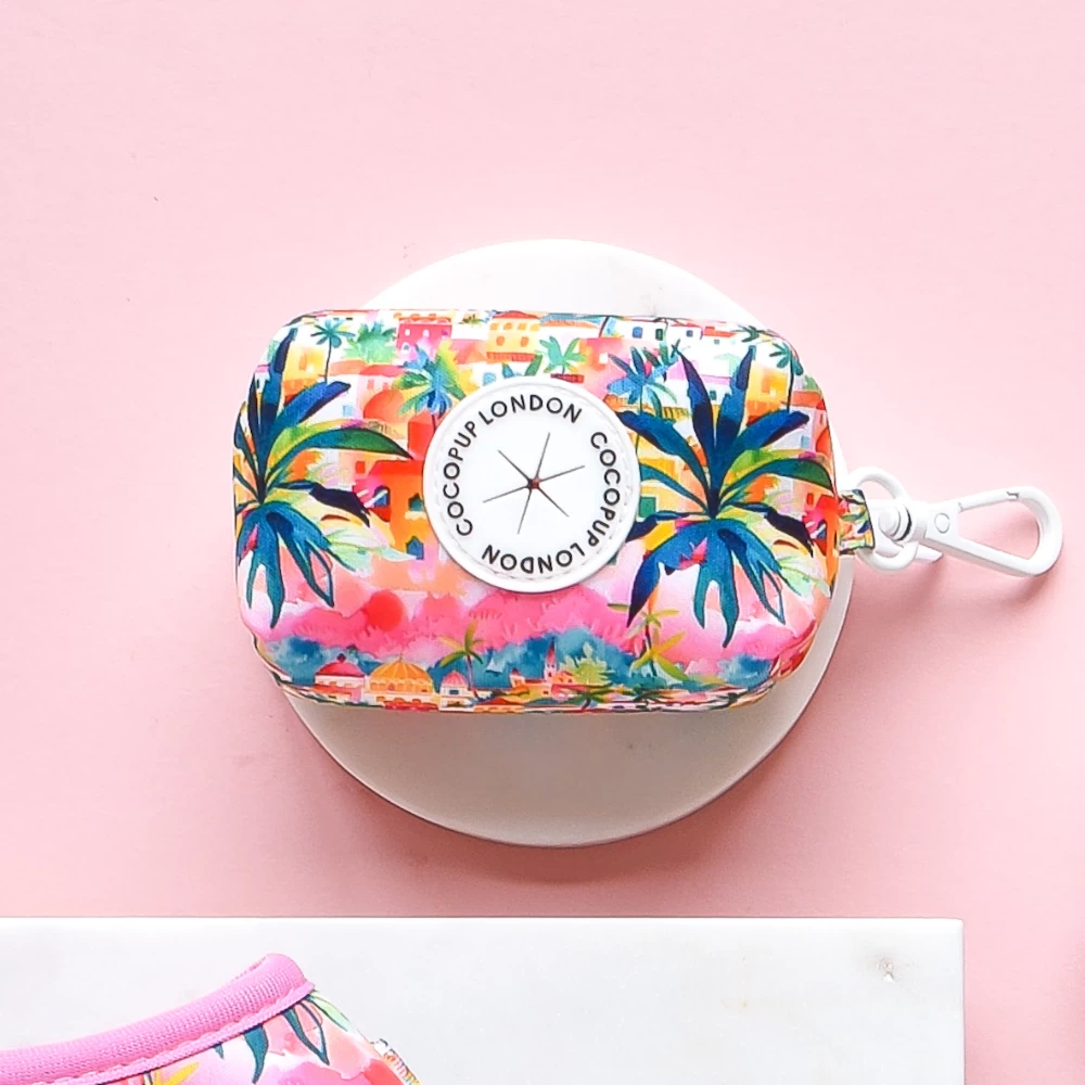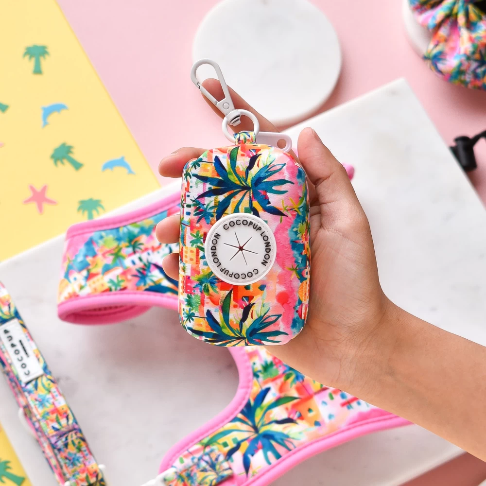 Keep your walks sunny with our Portofino Pup Poop Bag Holder. Perfect for summer strolls, this pink bag holder features palm trees and beachy vibes. Never let the holiday spirit fade away with our handy, yet stylish, poop bag holder!